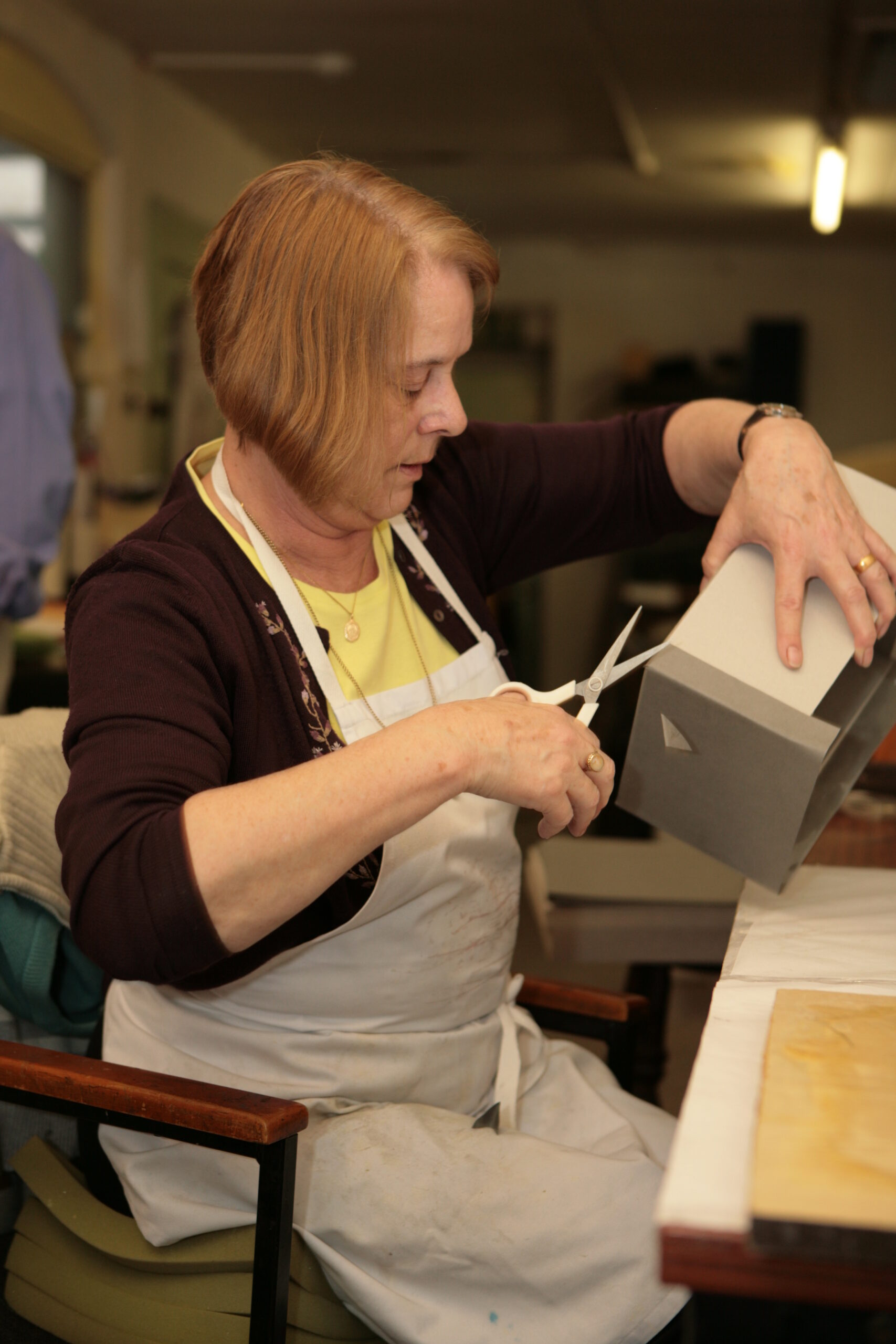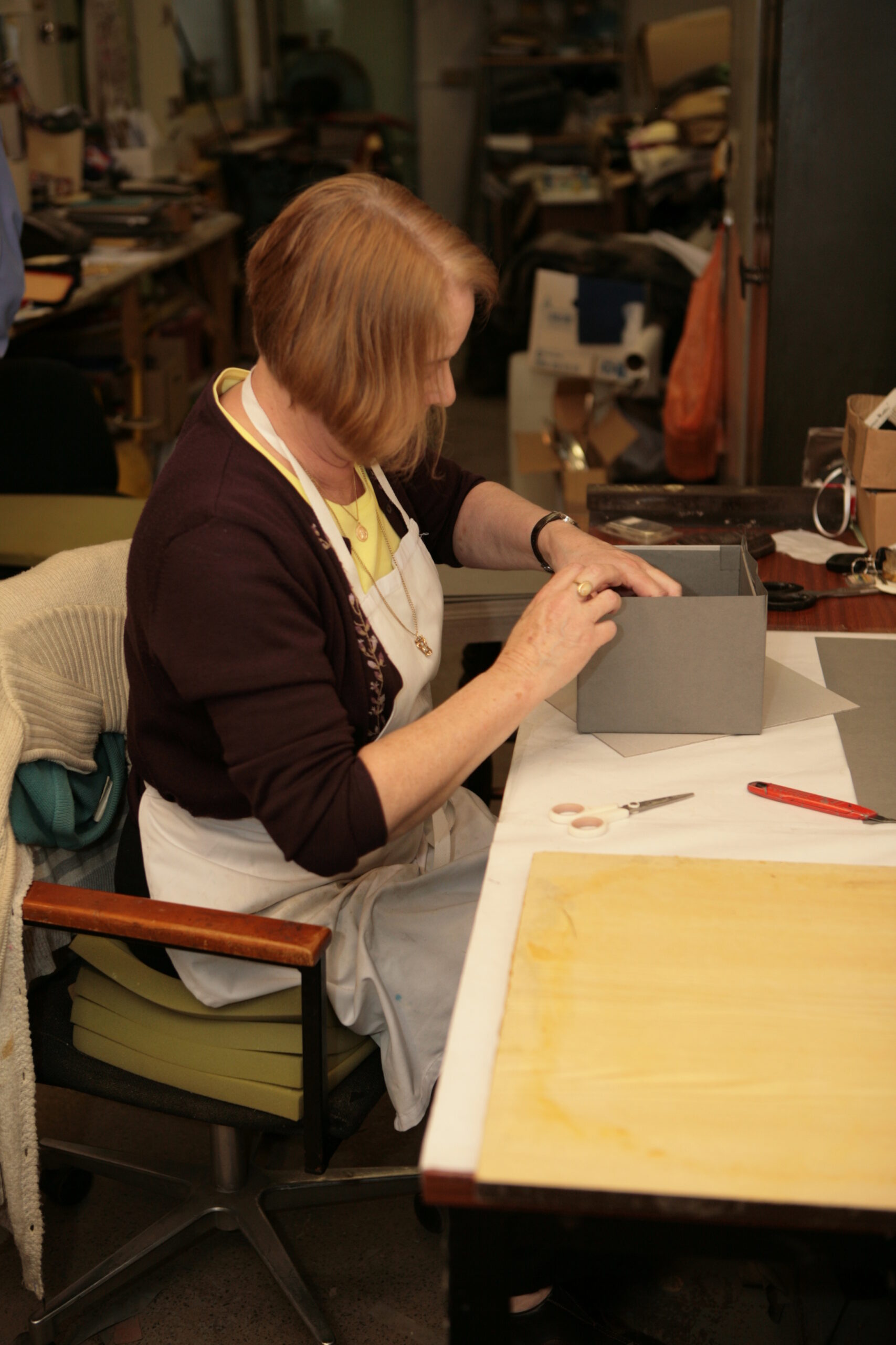When we order a box, it is cut out of card, scored, folded and taped into position. Each box is then covered in elegant grey paper, which is cut, glued and smoothed into place over the cardboard by hand. Because we know that you like to re use the boxes for other things, we cover the insides of the boxes and lids in matching paper so that they look lovely when you do.