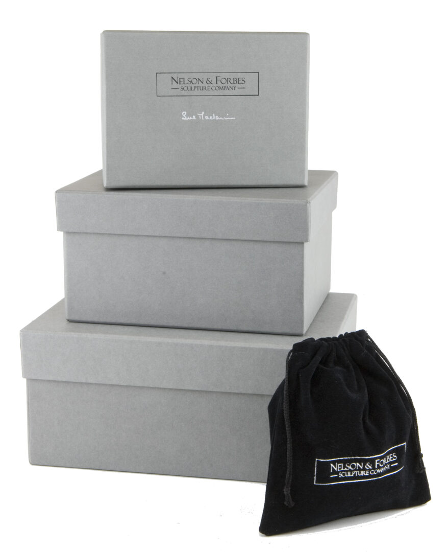 We created a box that is constructed from tough cardboard and covered with the highest quality textured paper. This paper is not only tough enough to ensure that your box looks lovely for years to come, but provides a non slip covering. This can be useful when the bronze sculpture inside is very heavy!