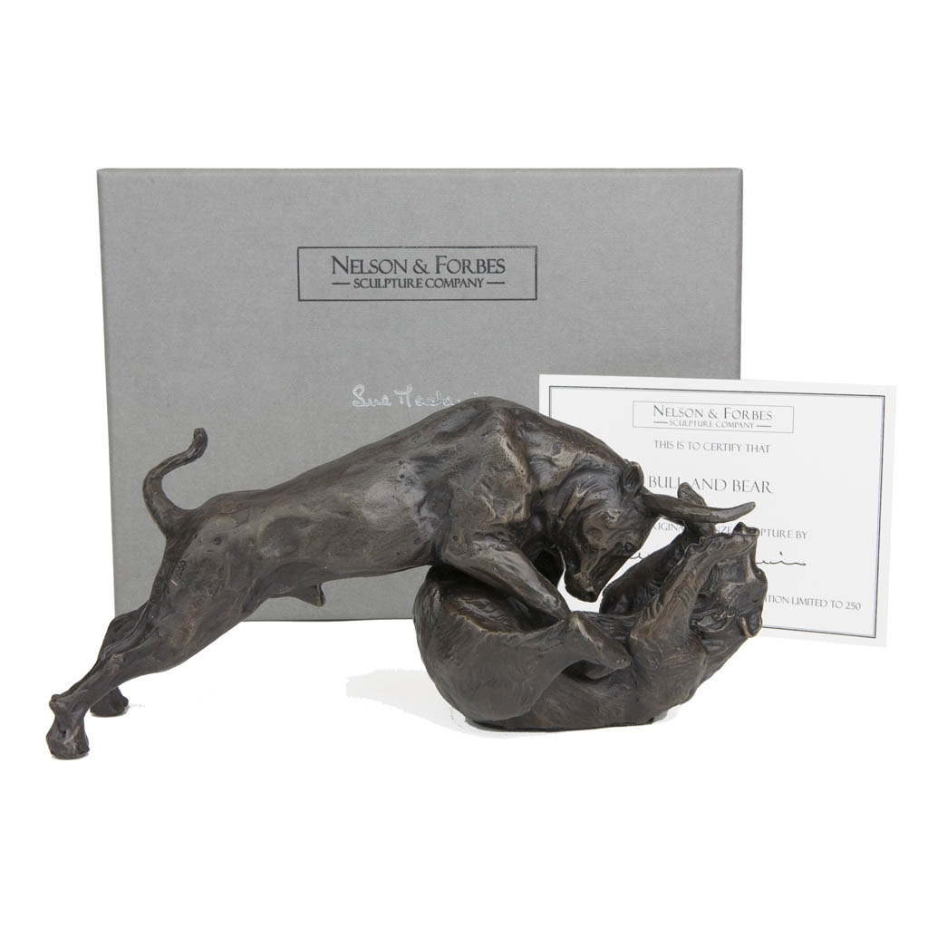 Cast in solid foundry bronze as a limited edition of just 250 castings wordwide, this bronze Bull and Bear sculpture arrives luxuriously presented in our signature Nelson & Forbes grey gift box with an artist signed and numbered certificate of authenticity.