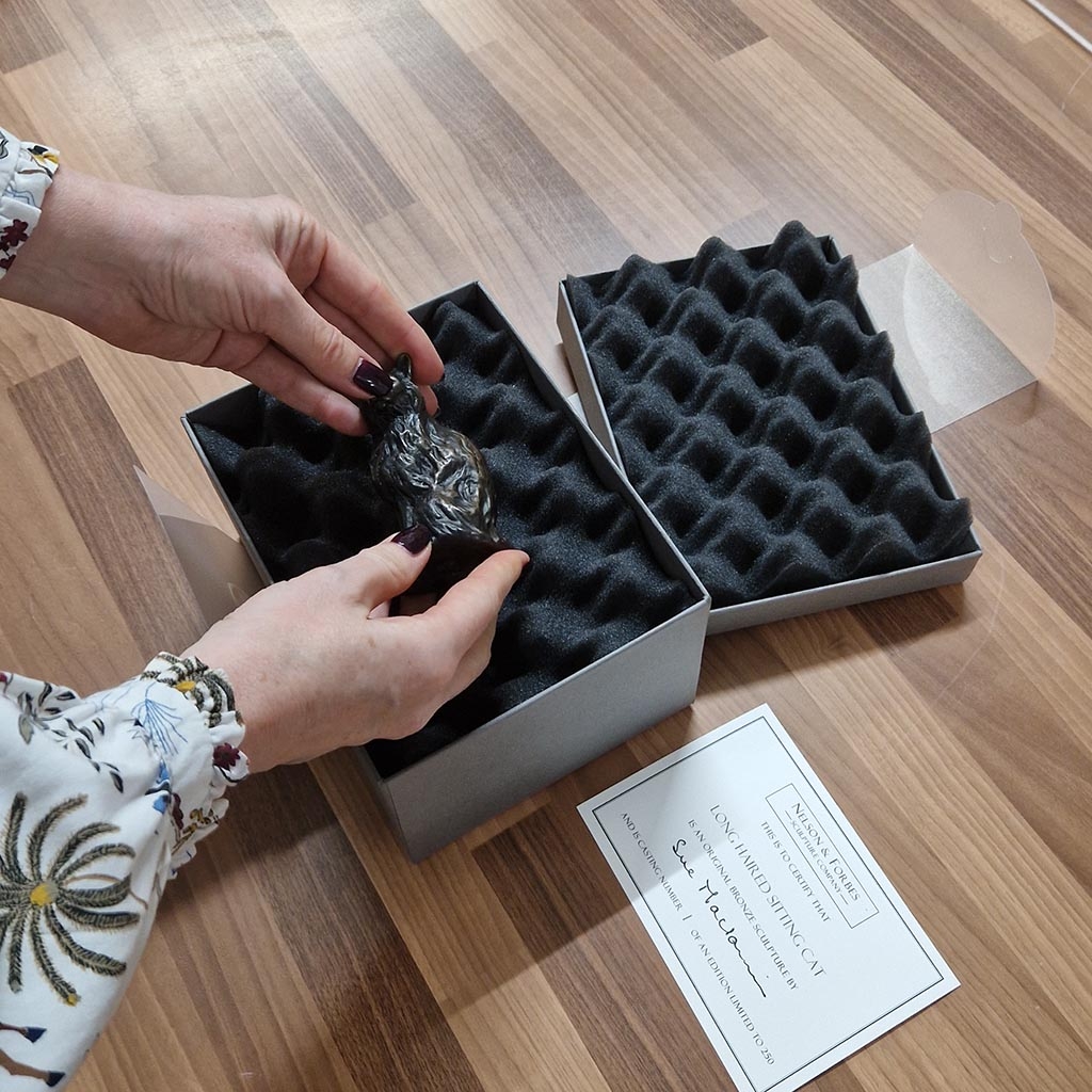 Your boxed sculpture is accompanied by a certificate of authenticity, printed by hand from an original copper plate engraving in Hampshire, signed by the artist and individually numbered with the edition number of your casting. This is your guarantee that this is an genuine Nelson & Forbes solid bronze casting of an original sculpture by Sue Maclaurin, that the artist has personally approved.
