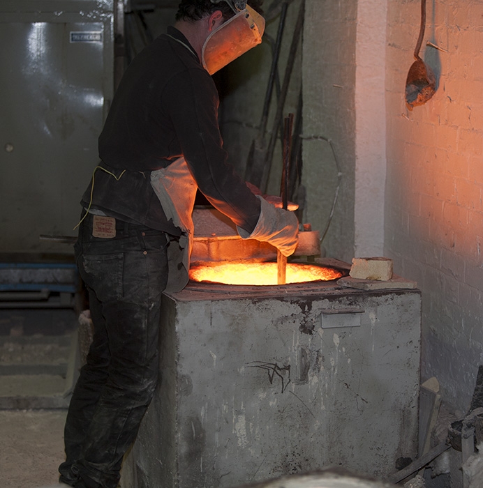 The wax model is coated in a ceramic shell and then fired in a kiln, a process that melts and “loses” the wax. This creates a hollow ceramic mould. Molten bronze, heated to an incredible 1200°C/2200°F, is immediately poured into this mould. Once cooled, the ceramic shell is carefully broken away, revealing the raw bronze sculpture inside.