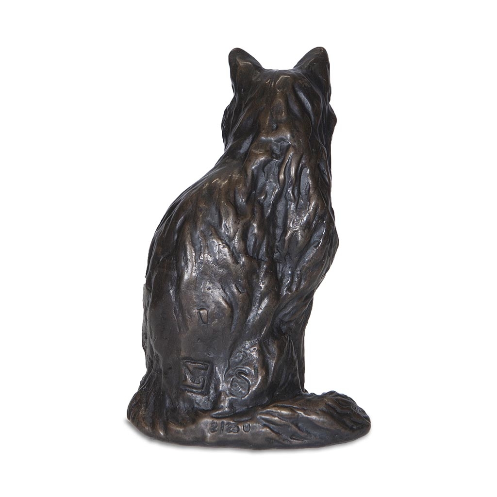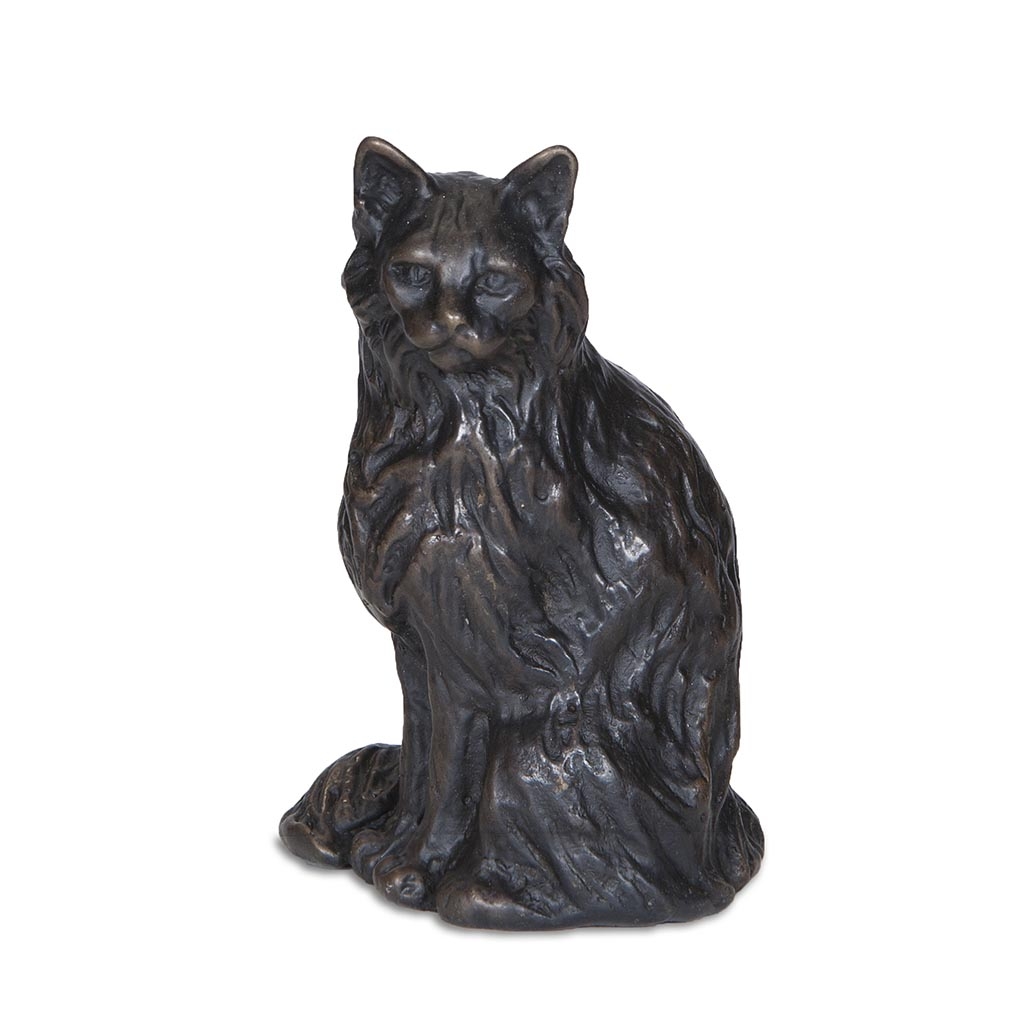 Hand cast in solid bronze, this gentle and expressive sculpture captures the quiet poise and graceful character of a beautiful long haired cat observed in a peaceful moment of contemplation.
