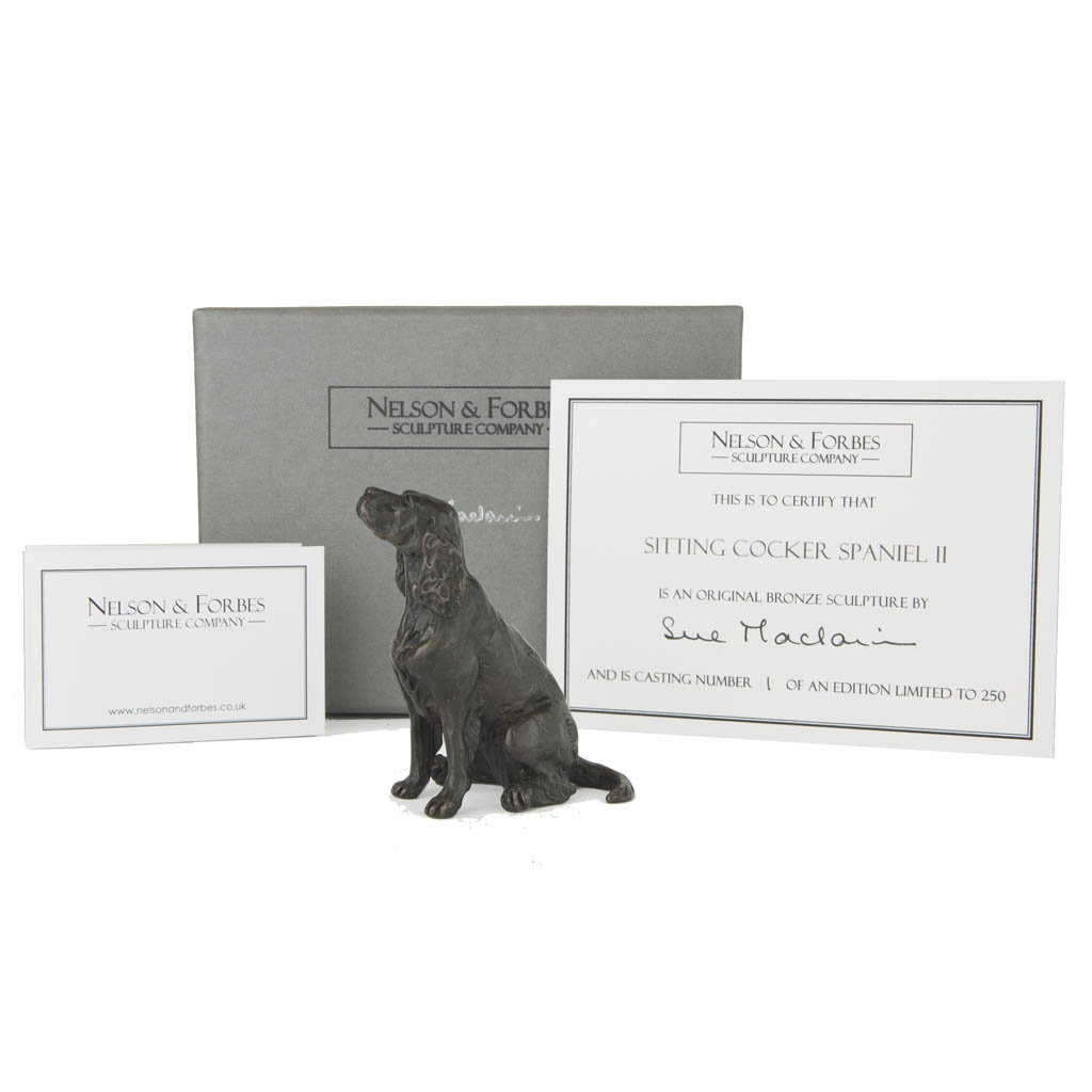 Sitting Cocker Spaniel II has been carefully hand cast in solid bronze in a British foundry using the ancient lost wax technique of casting bronze.  Each casting in the limited edition of 250 worldwide is entirely cast by hand, with a new mould being created and then destroyed during the weeks long casting process required for every casting.