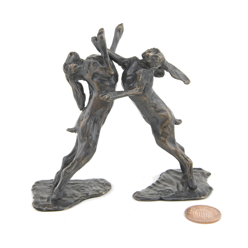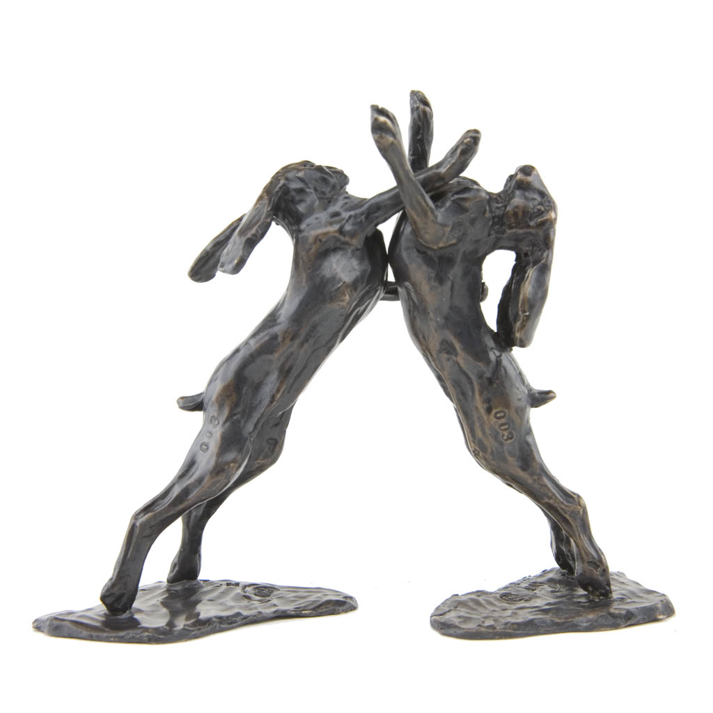 This Sue Maclaurin bronze sculpture, ‘Boxing Hares Maquette’ was cast by hand in a British foundry by Nelson & Forbes, as limited edition of just 500 castings.  It is part of the Nelson & Forbes ‘Studio Maquette Collection’, which was launched in 2015 following requests by collectors for miniature sculptures that would make ideal gifts.