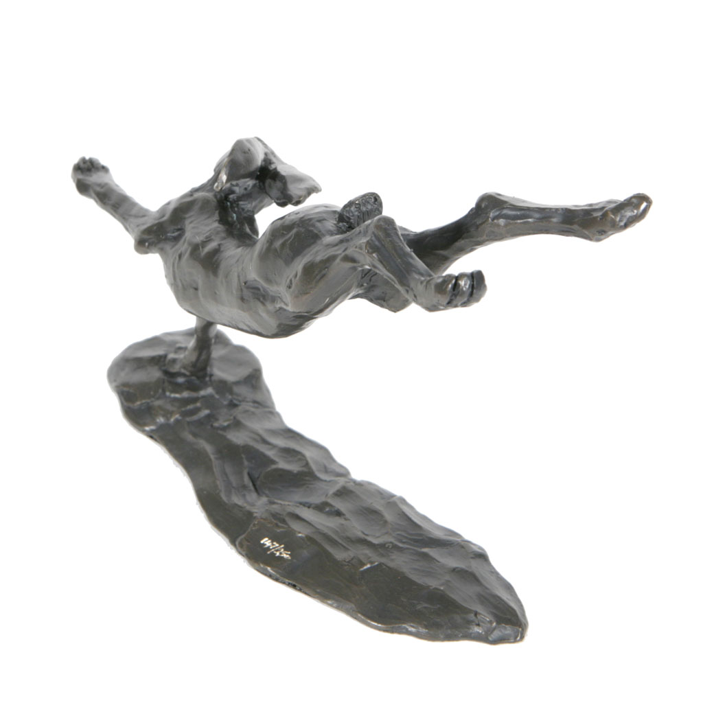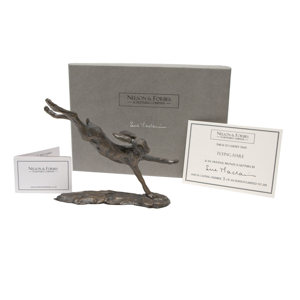 This solid bronze sculpture of a Sue Maclaurin Flying Hare (8″w x 5″h x 3″d) is a foundry casting by Nelson & Forbes of her original sculpture and took two weeks to create.