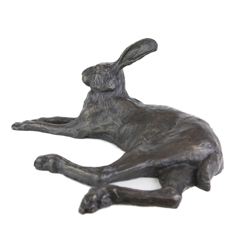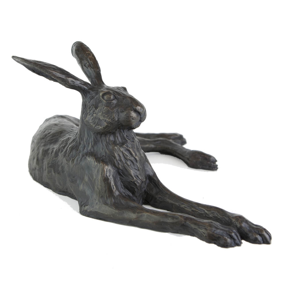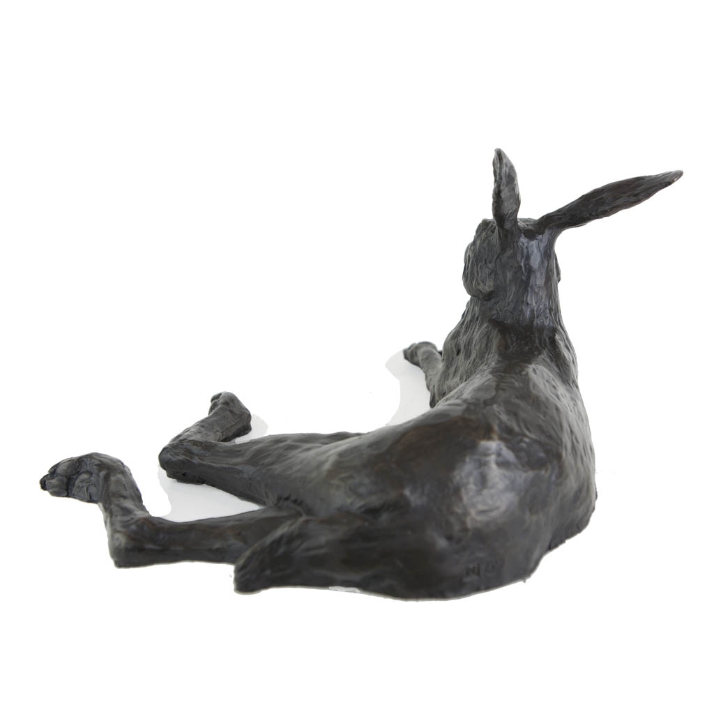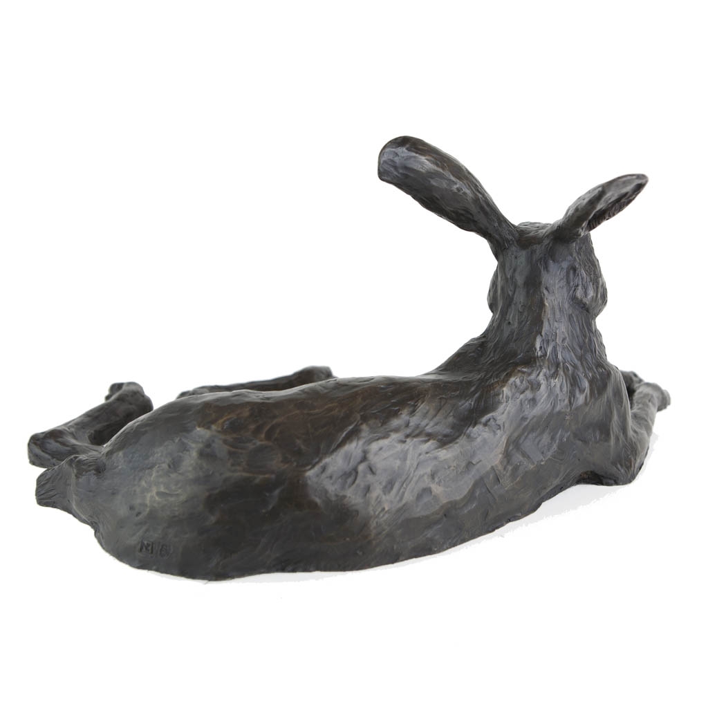 This magnificent life size sculpture of a lying hare by Sue Maclaurin beautifully captures an unguarded moment of an elegantly languid hare, enjoying some gentle relaxion in the afternoon sun.  While the pose may be peaceful, the bronze casting is impactful and is sure to raise a smile wherever it is displayed.