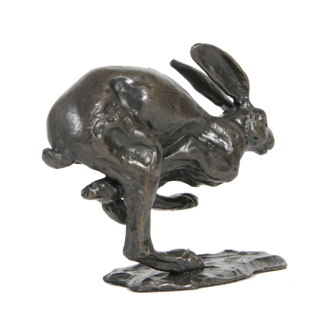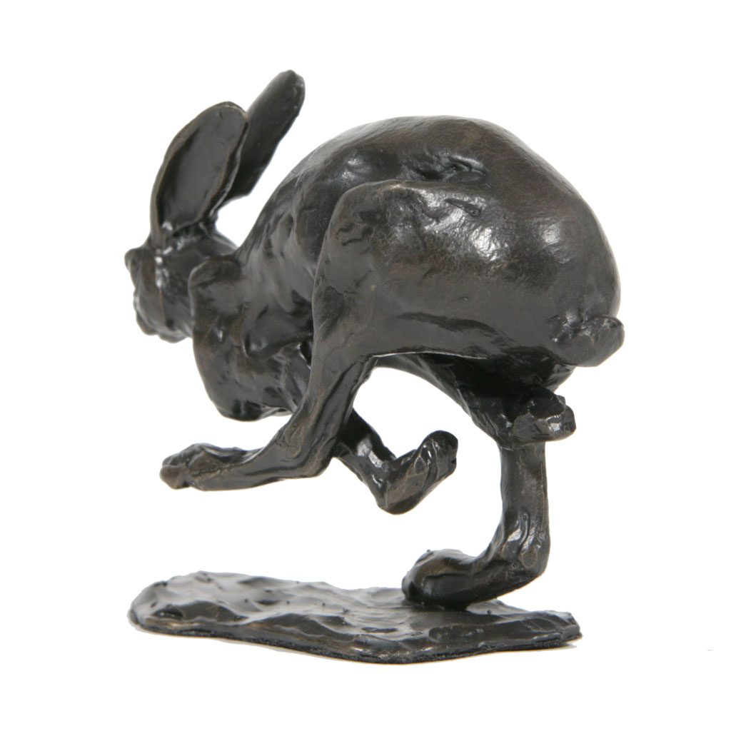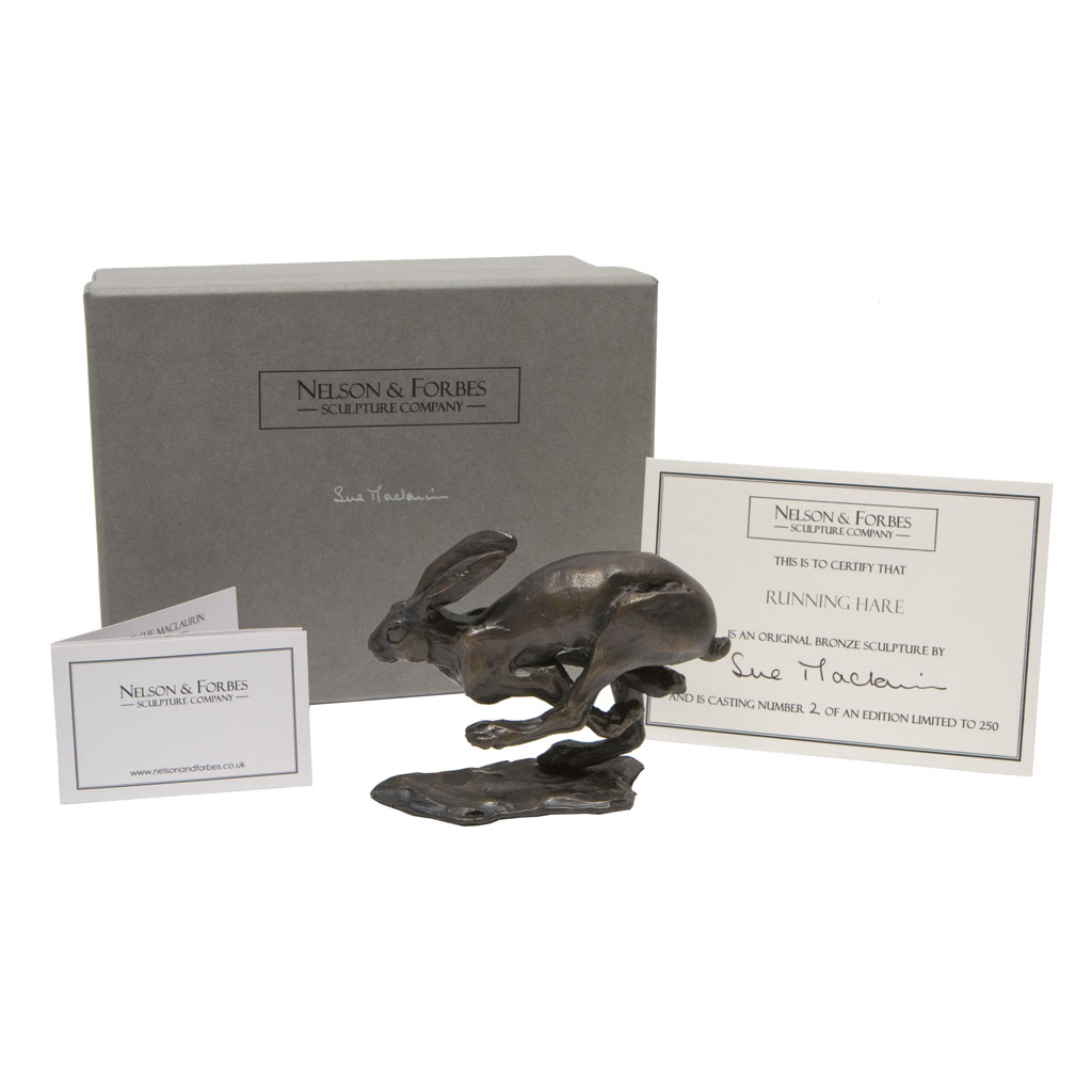 This solid bronze sculpture of a Sue Maclaurin Running Hare is a foundry casting of her original sculpture and took two weeks to create.