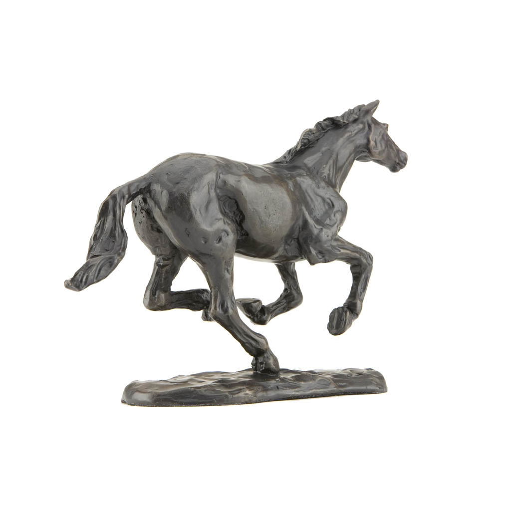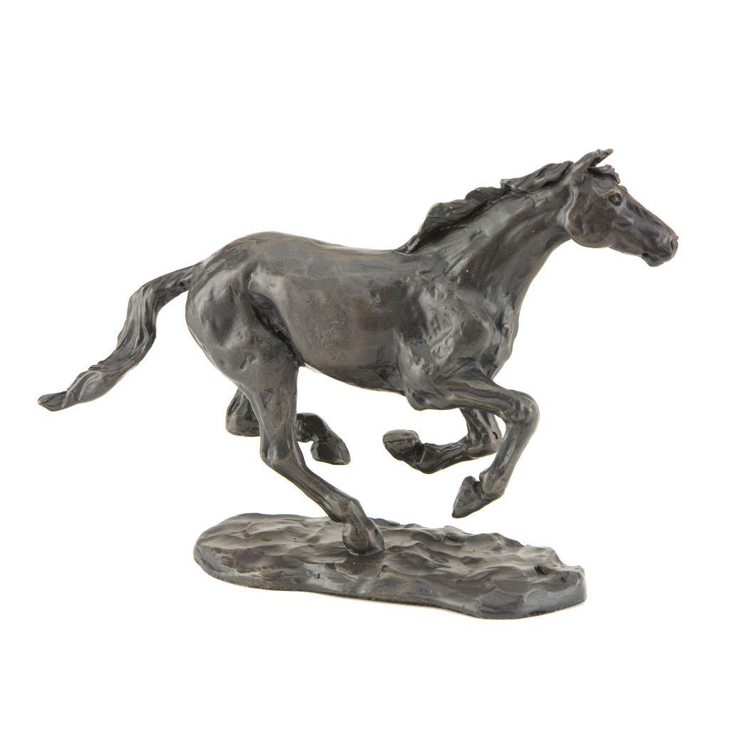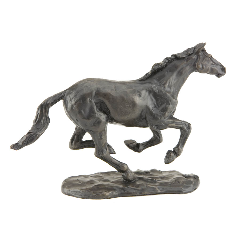 This glorious bronze horse sculpture, “Galloping Horse”, captures the freedom and joy of a happy horse in full exuberant stride. Created by sculptor and saddle maker Sue Maclaurin, it perfectly captures the freedom and grace of one of nature’s finest athletes at play.