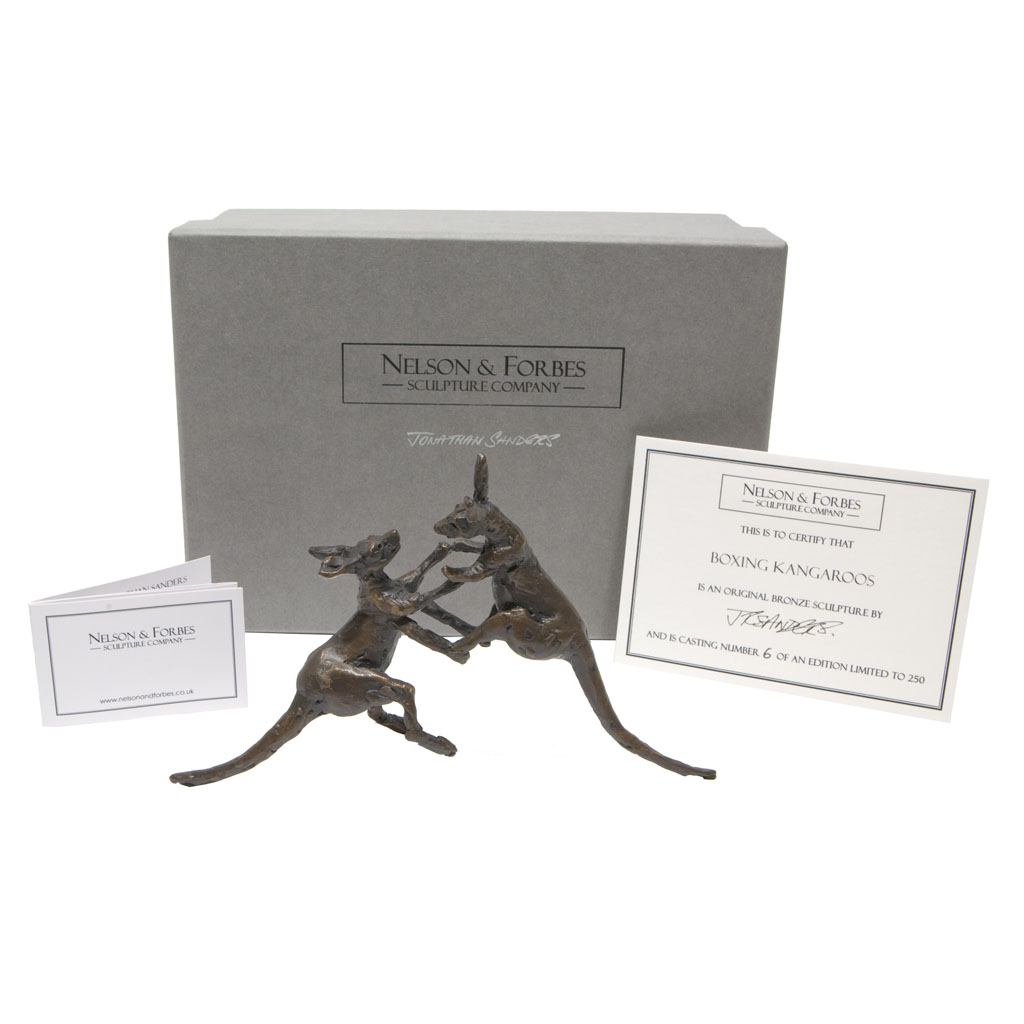 This Jonathan Sanders bronze sculpture ‘Boxing Kangaroos’ was cast by hand in a British foundry by Nelson and Forbes, in an edition of just 250 castings. It is presented in a sumptuous high quality English hand made gift box and is accompanied by a numbered certificate of authenticy, signed by the artist, Jonathan Sanders.