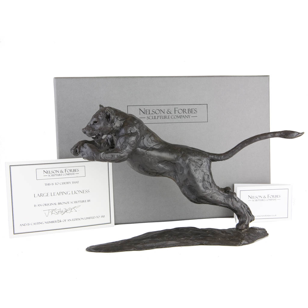 The original Large Leaping Lioness sculpture was created by Jonathan Sanders, before being carefully hand cast in solid bronze by Nelson and Forbes in a British foundry.  It is presented in an British hand made gift box, together with a numbered certificate of authenticity, signed by the artist, Jonathan Sanders.