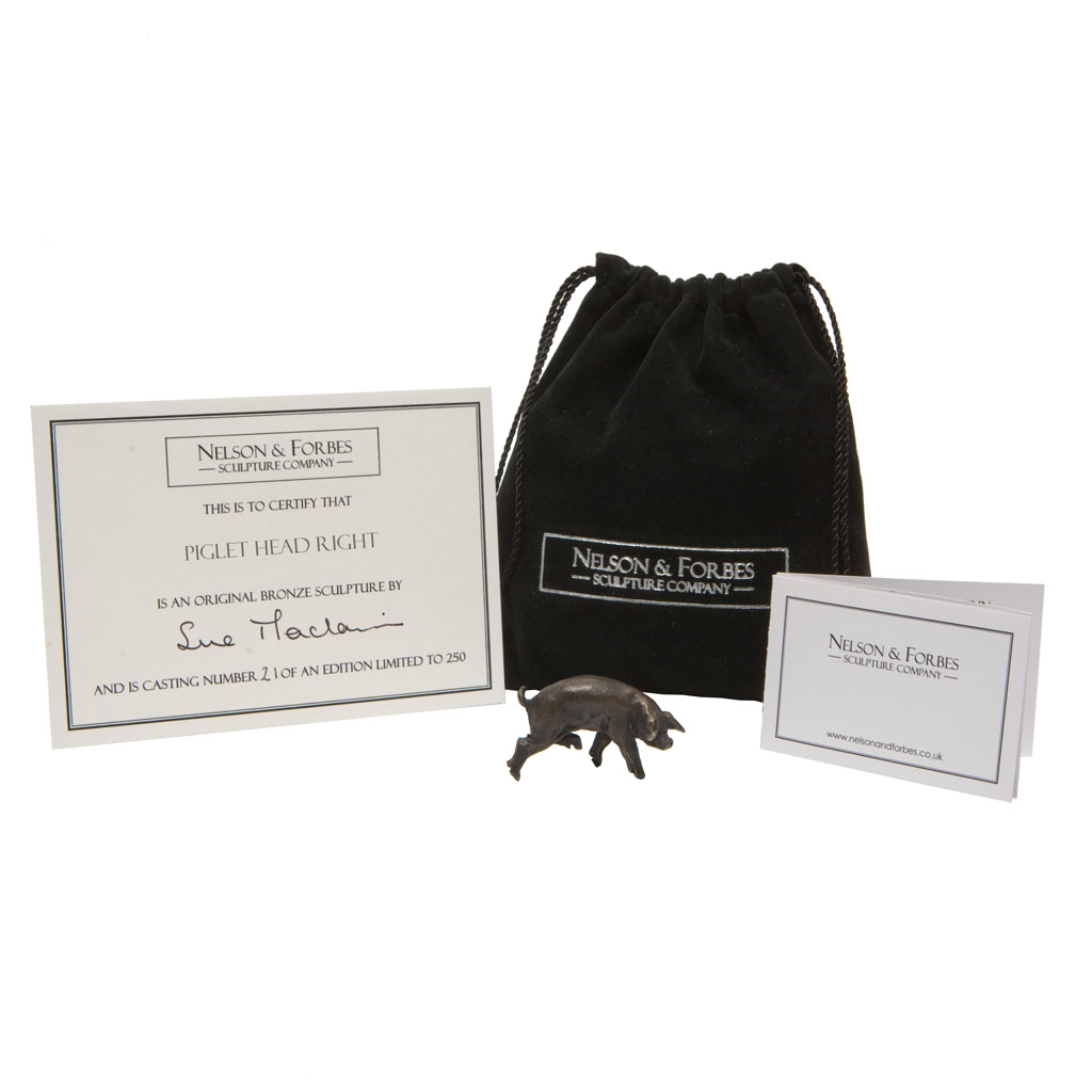 This solid bronze sculpture of a Sue Maclaurin piglet is a foundry casting of her original sculpture and took two weeks to create.