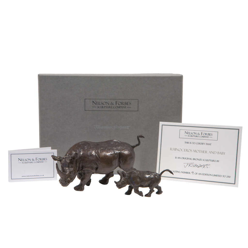 This Jonathan Sanders bronze sculpture of a Rhinoceros Mother and Baby was cast by hand in a British foundry by Nelson and Forbes, in an edition of just 250. It is presented in a high quality English hand made gift box and is accompanied by a numbered certificate of authenticity, signed by the artist, Jonathan Sanders.