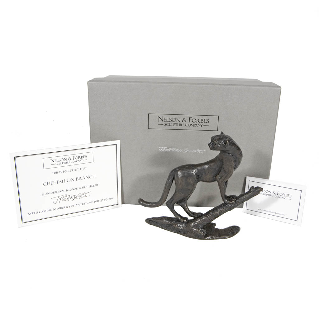 This Jonathan Sanders bronze sculpture of a cheetah majestically surveying its domain was cast by hand in a British foundry by Nelson & Forbes, in an edition of just 250 castings. The sculpture is presented in a sumptuous British handmade gift box and is accompanied by a numbered certificate of authenticity, signed by the artist, Jonathan Sanders. This piece is the same scale as Jonathan Sanders’s Flying Cheetah, Seated Cheetah and Lying Cheetah, so they make a dynamic pair or set when displayed together.