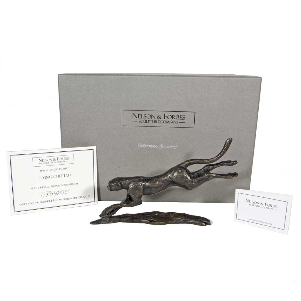 This stunning Jonathan Sanders bronze sculpture of a cheetah in full flight was cast by hand in a British foundry by Nelson & Forbes, in an edition of just 250 castings. The sculpture is presented in a sumptuous hand made English gift box and is accompanied by a numbered certificate of authenticity, signed by the artist, Jonathan Sanders. This piece is the same scale as Jonathan Sanders’s Cheetah on Branch, Seated Cheetah and Lying Cheetah, so they make a dynamic pair or set when displayed together.