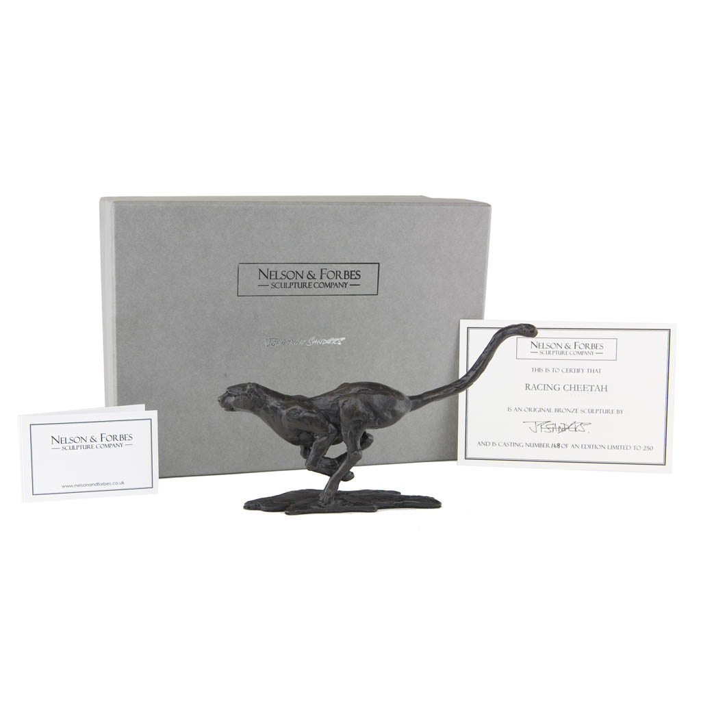 This gorgeous Jonathan Sanders bronze Racing Cheetah was cast by hand in a British foundry by Nelson & Forbes, in an edition of just 250 castings and it perfectly captures the explosive power of the cheetah as it launches itself across the African Savannah.  The sculpture is presented in a sumptuous hand made British gift box and is accompanied by a numbered certificate of authenticity, signed by the artist, Jonathan Sanders.  This piece is the same scale as Jonathan Sanders’s magnificent Flying Cheetah and Cheetah on Branch, so they look wonderful when they are displayed together.