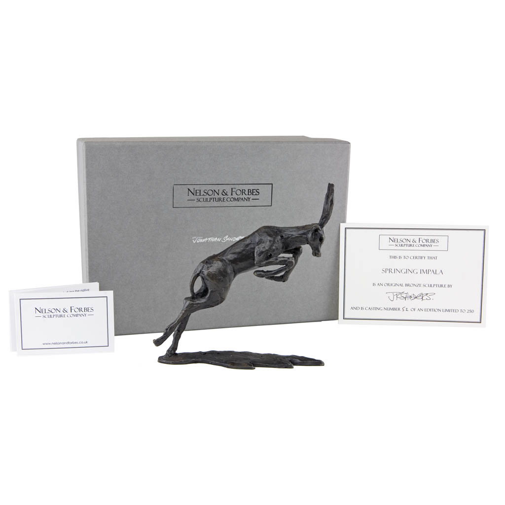 This stunning Jonathan Sanders bronze sculpture of a delicate Impala springing into the air was cast by hand in a British foundry by Nelson & Forbes, in an edition of just 250 castings. The sculpture is presented in a sumptuous hand made British gift box and is accompanied by a numbered certificate of authenticity, signed by the artist, Jonathan Sanders.