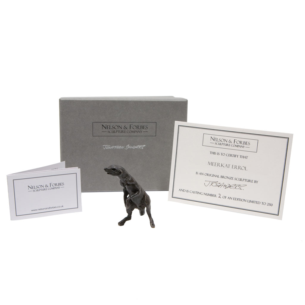 This Jonathan Sanders bronze sculpture of a meerkat  was cast by hand by Nelson & Forbes in a British foundry, in an edition of just 250 castings. It is presented in a high quality English hand made gift box and is accompanied by a numbered certificate of authenticity, signed by the artist, Jonathan Sanders.